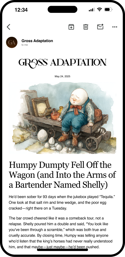 You know the characters, but you haven't seen them quite like this before. Get bitesize and absurd retellings of the stories you know and love delivered straight to your inbox every week.